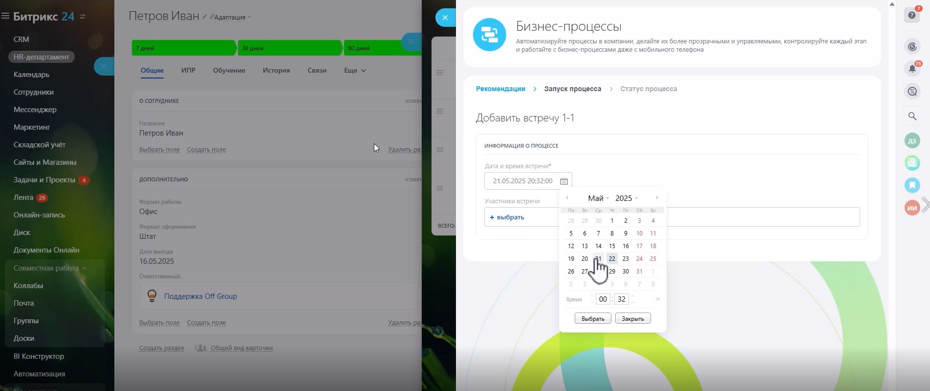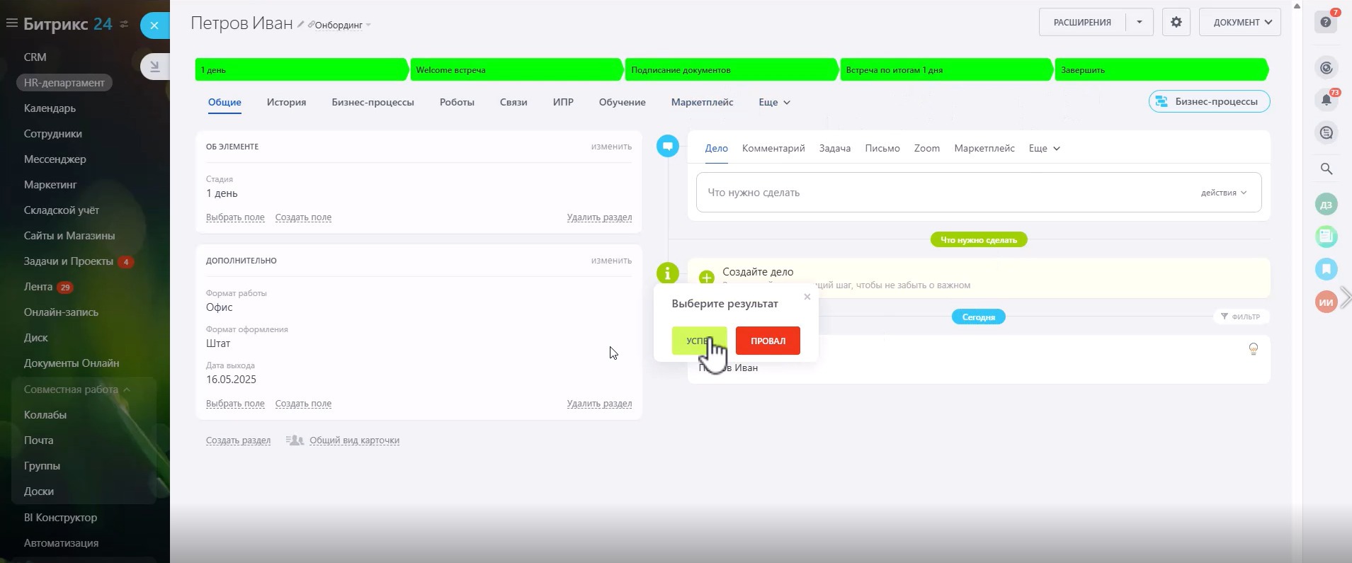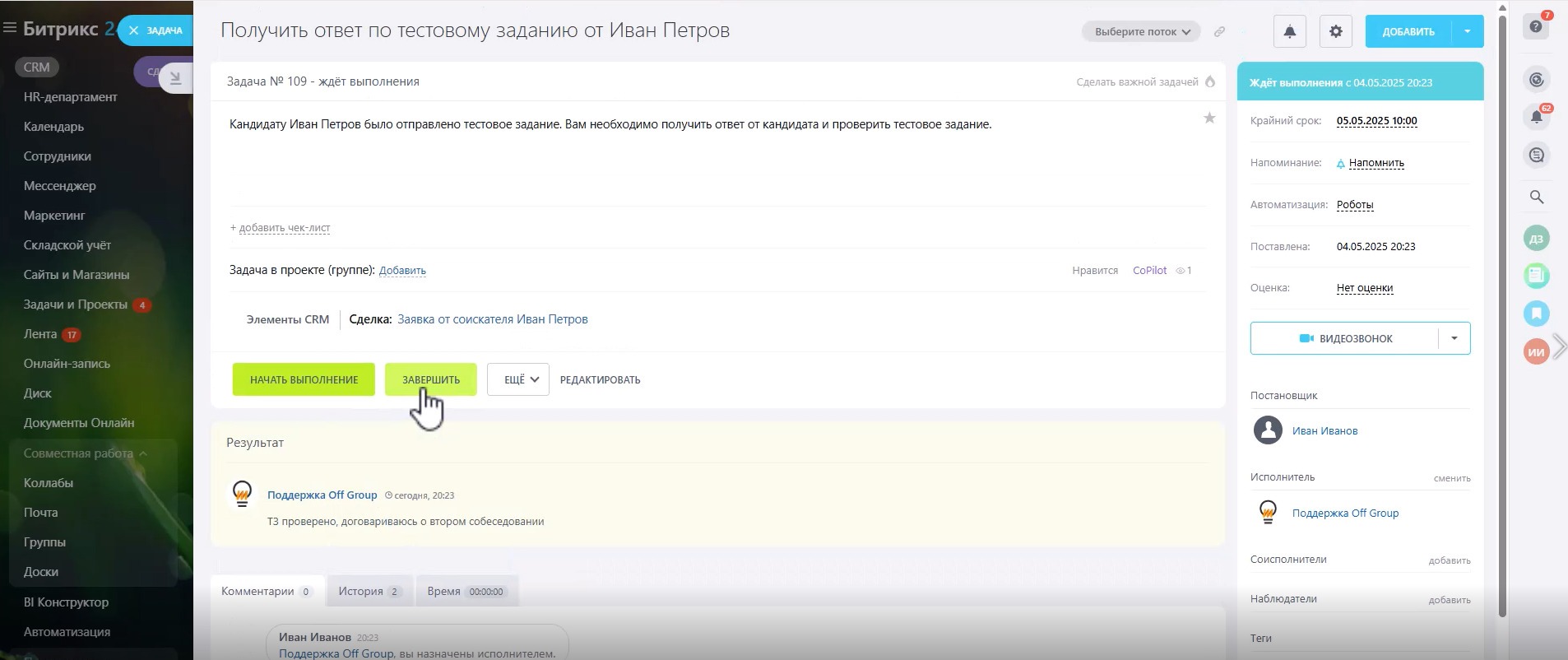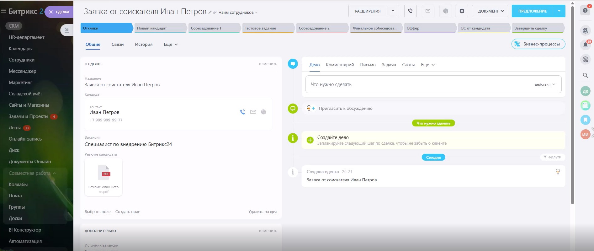 HR согласует дату встречи, фиксирует её в календаре Битрикс24 и переводит сделку в стадию «Первое собеседование». Создаётся задача «Провести собеседование»..jpeg)