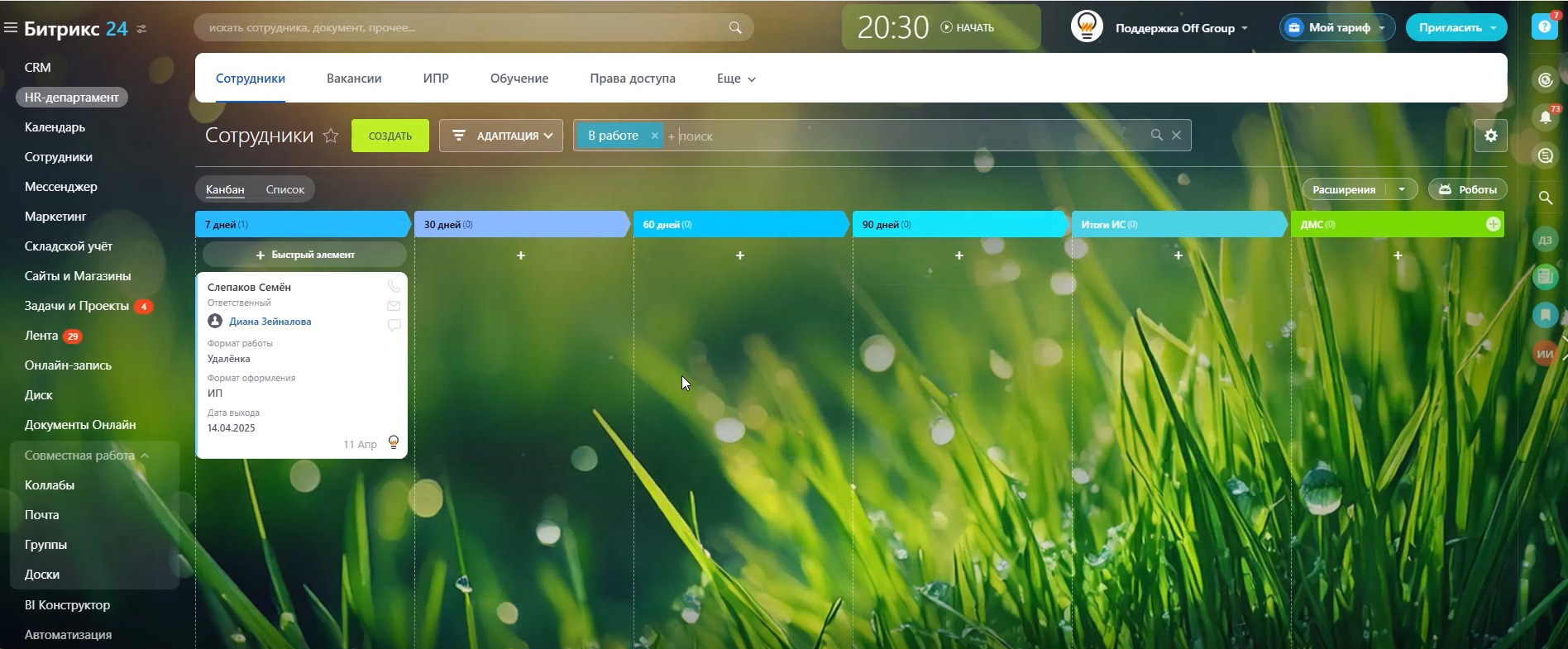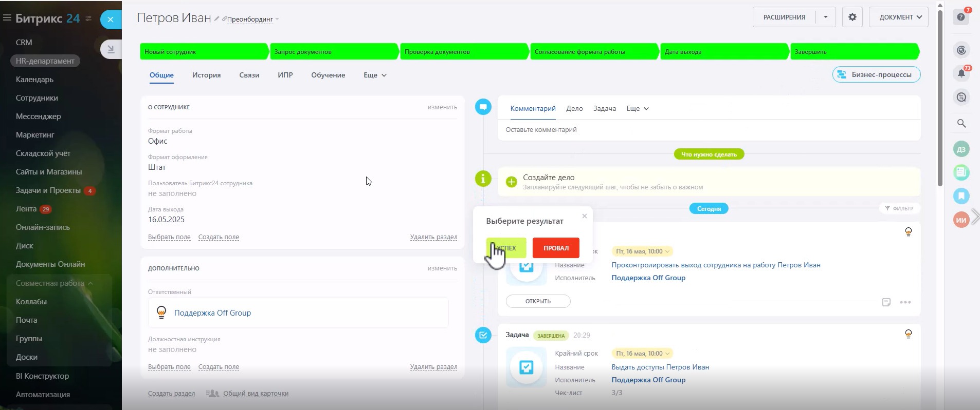 Завершив адаптацию, сотрудник получает статус «Сотрудник успешно работает».
