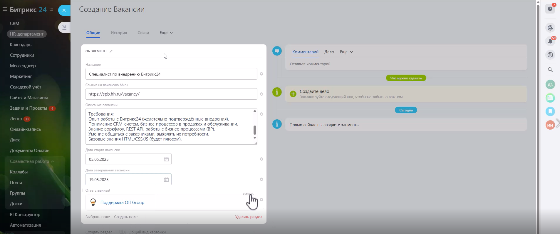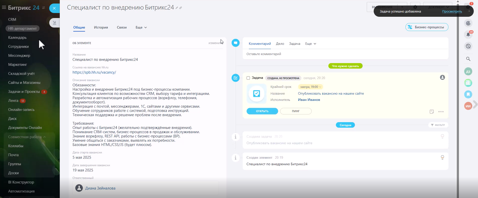 При необходимости создаются дополнительные задачи, например публикация вакансии на сайте компании.